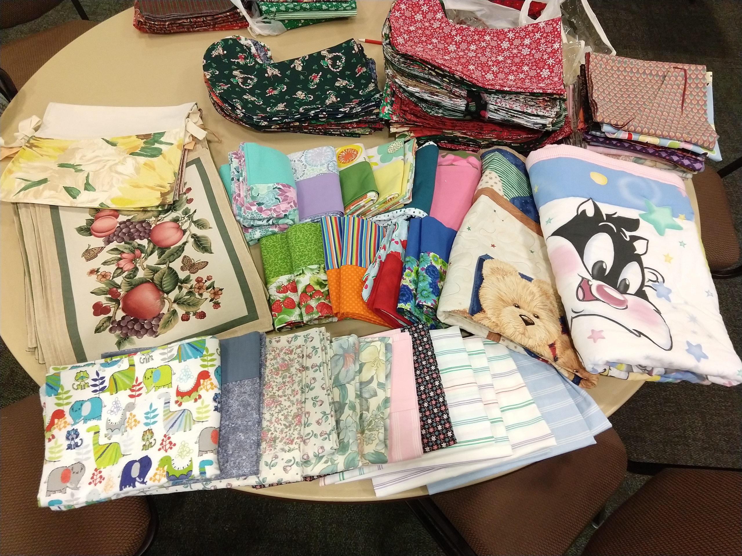 Come join us and make a difference in the community! We make a variety of items: fleece hats/mittens, pediatric pillows, clothing protectors, baby blankets/burp cloths, bandana bibs, Christmas stockings for the troops, quilts, altar linens, walkers bags, and clothing protectors for the elderly, plus much more! No experience is necessary…we need help pressing, cutting, and pinning. We can also teach or refresh sewing skills for those who are interested. We have sewing machines and a variety of donated fabrics.